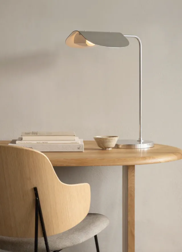 Wing-bordlampen har fått navnet sitt fra sin vingelignende skjerm, som minner om en fugl på flukt. Designet på 1980-tallet av Kenneth Bergenblad, har det stringente designet et lekent preg. Den polerte aluminiumsskjermen roterer for å rette lyset dit det trengs. Et utsagnskapende stykke i enhver setting, dens minimale estetikk sikrer at den smelter sømløst inn i ethvert hjem.