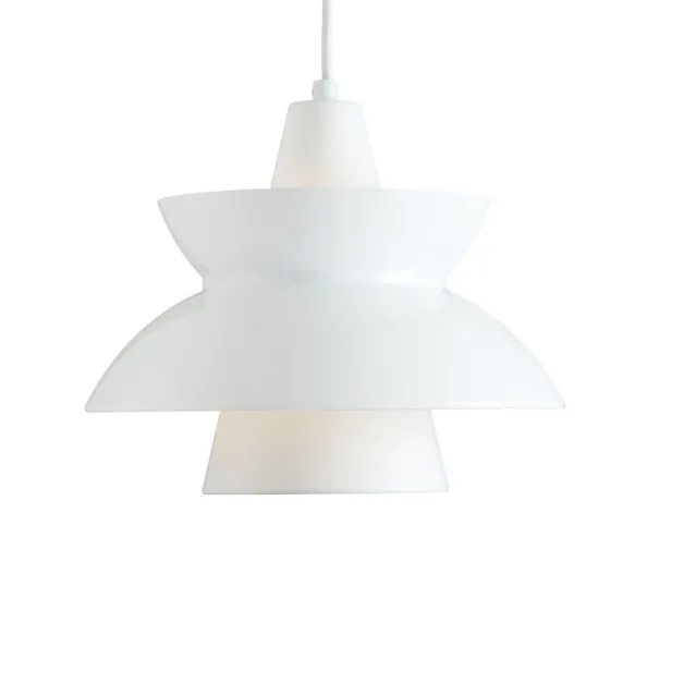 Konsept: Armaturen gir primært en nedadrettet og myk belysning via den hvitlakkerte kjegleformede reflektoren på innsiden. Den ytre reflektoren og hovedskjermen bidrar til å dirigere lyset oppover og nedover, samtidig som den gir et mykt og diffust lyst. Innsiden av skjermen lyses opp via en åpning i den mindre kjegleformede reflektoren.