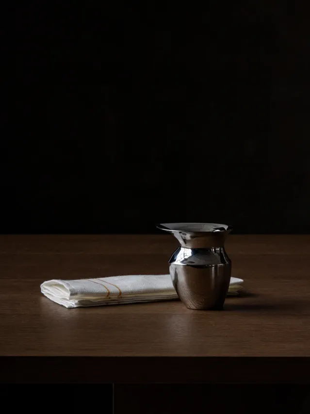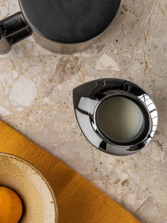 En moderne tolkning av det klassiske romerske karet, den etruskiske kannen serverer melk eller fløte med minimalistisk eleganse.