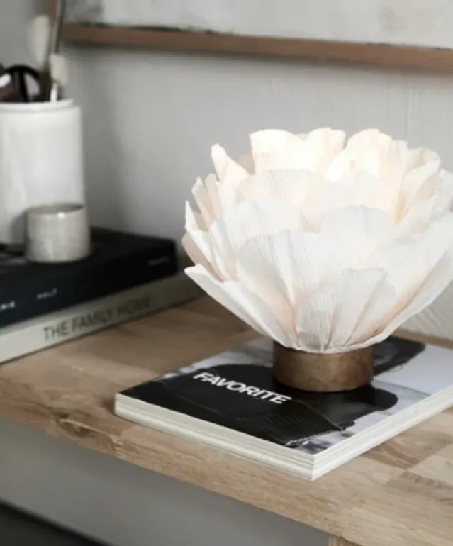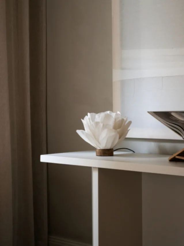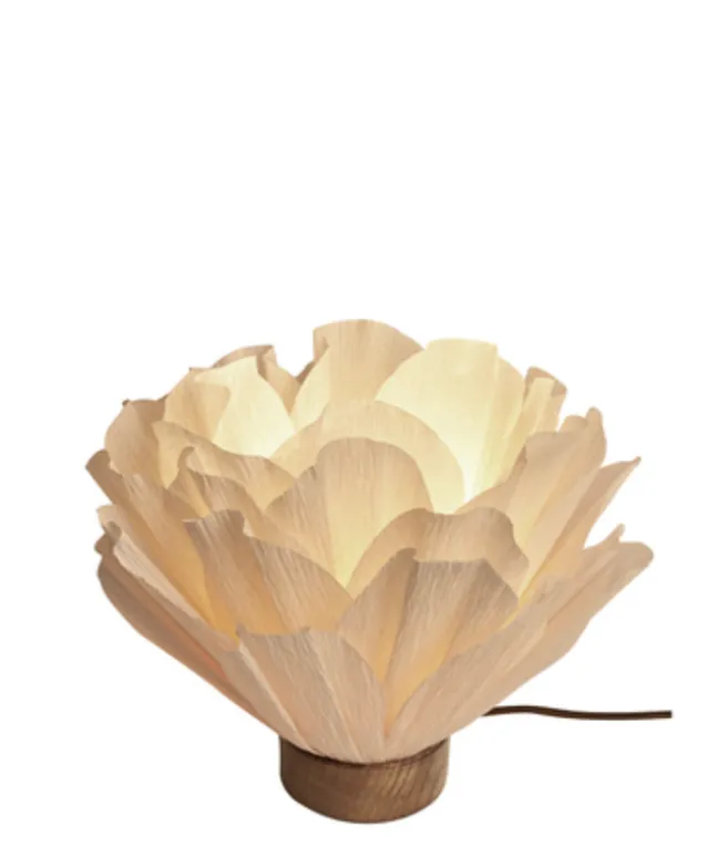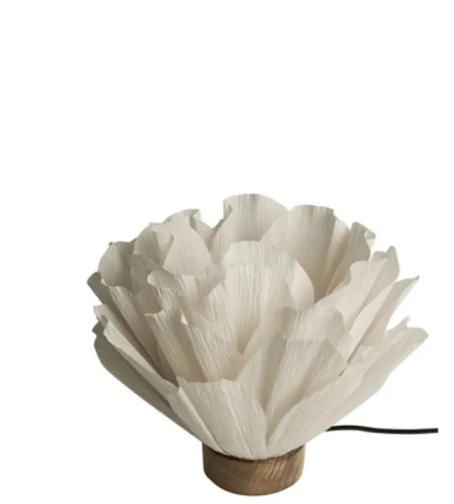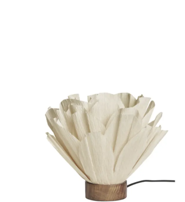 Lisa er en bedårende bordlampe inspirert av lotusblomstens skjønnhet. Med sine myke, fleksible kronblader laget av krepp-papir skaper den et mildt og rent lys. Mangotre-basen tilfører naturlig varme og jordnær eleganse, mens den svarte tekstil-ledningen gir en elegant kontrast. Lisa-bordet er perfekt å plassere på et nattbord, et sidebord eller i et vindu, og er mer enn bare en lampe – det er et kunstverk som gir hjemmet ditt et unikt preg.